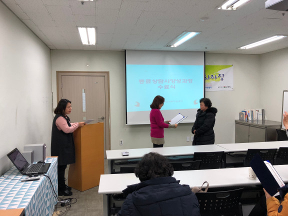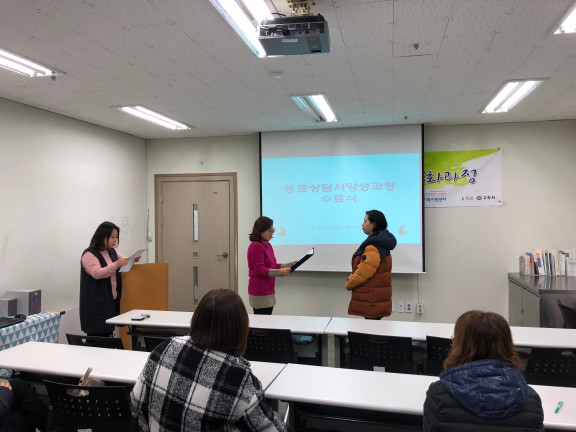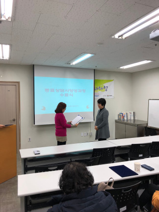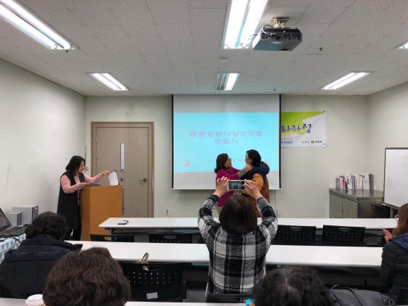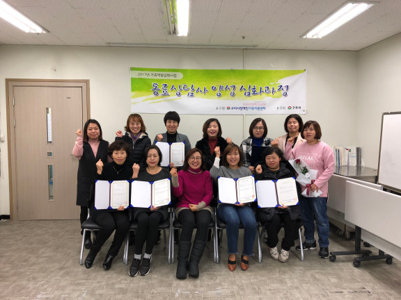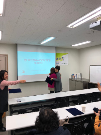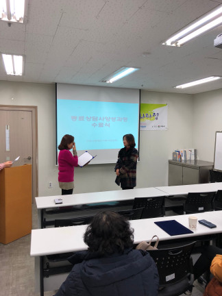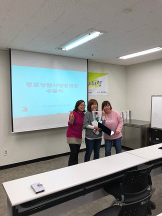 동료상담사 심화과정 12주차(목) 수료식 페이지 정보 작성자 김아롬 댓글 0건 조회 2,151회 작성일 17-12-08 00:20 목록 본문 페이스북 공유 트위터 공유 구글+ 공유 이전글동료상담사 자조모임 협동조합 <이야기가 있는 사람들> 방문 17.12.08 다음글부모교실 토탈공예 8주차 (월) : 토탈공예 17.12.06