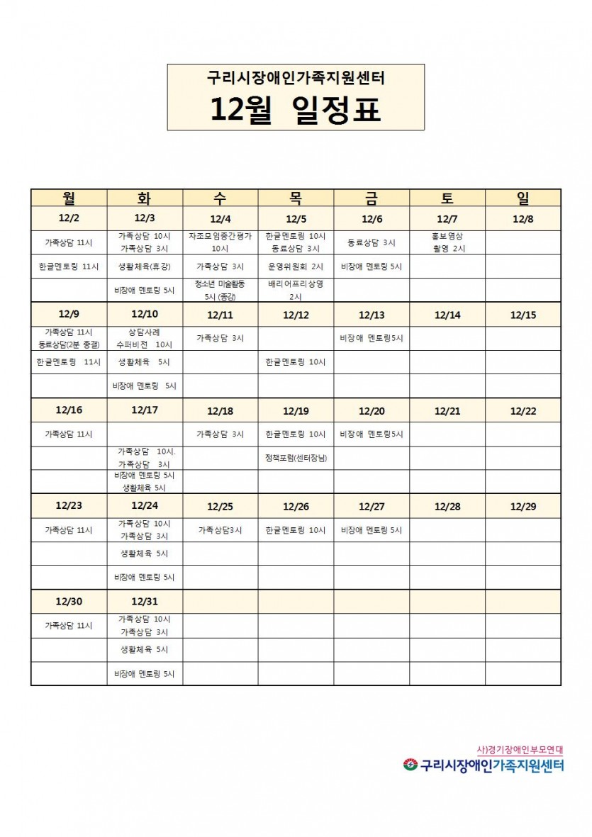 12월 센터일정표 페이지 정보 작성자 관리자 댓글 0건 조회 9,313회 작성일 19-12-03 00:18 목록 본문 페이스북 공유 트위터 공유 구글+ 공유 이전글센터 휴무일 공지(12/25, 2020년 1/1) 19.12.12 다음글11월 센터일정표 19.11.05 댓글 0 댓글목록 등록된 댓글이 없습니다.