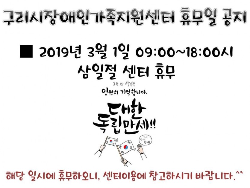 센터 휴무일 안내(3/1) 페이지 정보 작성자 관리자 댓글 0건 조회 8,266회 작성일 19-02-25 00:18 목록 본문 페이스북 공유 트위터 공유 구글+ 공유 이전글구리시장애인가족지원센터 3월 일정표 19.02.26 다음글장애인가족심리상담 참여자 모집 19.02.13 댓글 0 댓글목록 등록된 댓글이 없습니다.