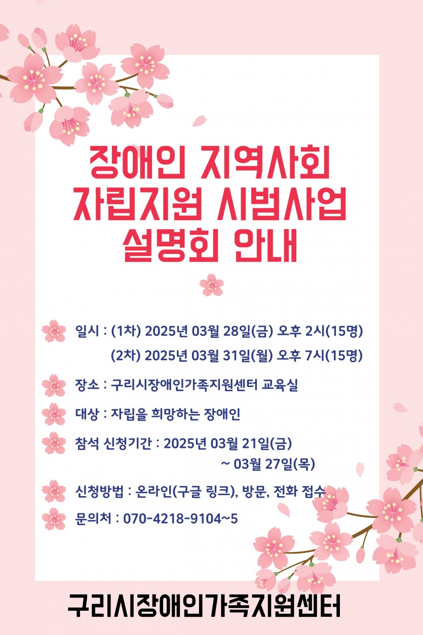 장애인 지역사회 자립지원 설명회 개최 안내 페이지 정보 작성자 가족지킴이 댓글 0건 조회 2,608회 작성일 25-03-21 14:08 목록 본문 페이스북 공유 트위터 공유 구글+ 공유 2025년 장애인 지역사회 자립지원 설명회 개최 안내온라인 신청: https://forms.gle/ECUddiQPpwUdv4w69 이전글25년 4월 구리시장애인가족지원센터 일정안내 25.04.04 다음글25년 3월 구리시장애인가족지원센터 일정안내 25.03.06 댓글 0 댓글목록 등록된 댓글이 없습니다.
