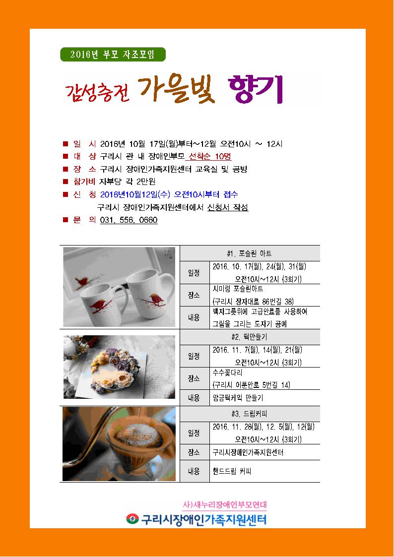 2016년 부모 자조모임 감성충전 가을빛 향기 (사진 첨부) 페이지 정보 작성자 김용기 댓글 0건 조회 9,104회 작성일 16-10-11 00:18 목록 본문 페이스북 공유 트위터 공유 구글+ 공유 이전글발달장애인 자립생활준비 체험홈 프로그램 모집안내 16.12.09 다음글발달장애부모 힐링 백일장 어머니, 나르샤 공고 16.09.28 댓글 0 댓글목록 등록된 댓글이 없습니다.