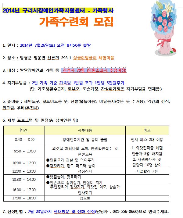 6. 신청방법 : 7월 23일까지 센터방문 및 전화 신청(담당자 : 031-556-0660)으로 연락주세요.